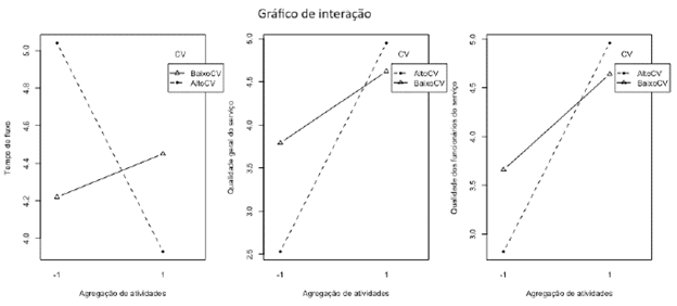 As três interações analisadas indicam um efeito moderador da variabilidade no tempo das tarefas. Contrariando os resultados esperados com base nas simulações e na teoria das filas, observaram-se valores mais favoráveis para o tempo de fluxo, para a qualidade geral do serviço e para a satisfação dos clientes com os funcionários em cenários com maior variabilidade (Figura 6). Os dados das simulações, por sua vez, indicam que um baixo coeficiente de variação tende a resultar em menores filas e tempos de espera, especialmente quando há agregação de recursos.