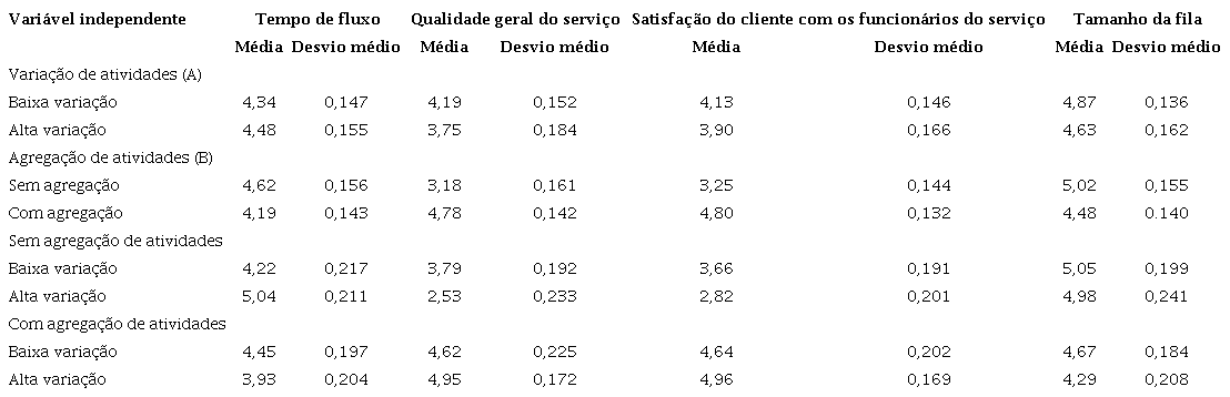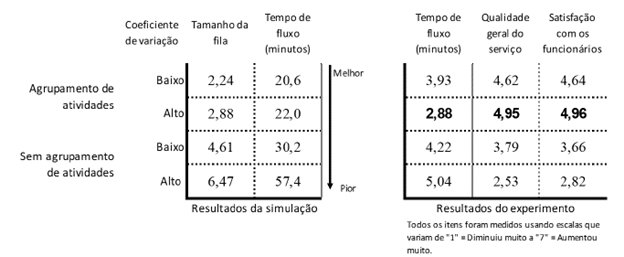 Testes univariados adicionais mostraram que o uso de agregação de atividades levou a uma diminuição no tempo de fluxo (F = 4,46; p < 0,05) e no tamanho da fila (F = 6,62; p < 0,05). Esses testes também evidenciaram que a agregação de atividades levou a um aumento na qualidade geral do serviço (F = 61,71; p < 0,001 ) e na satisfação do cliente com os funcionários do serviço (F = 61,71; p < 0,001). Além disso, os testes univariados indicaram que o aumento da variabilidade no tempo das atividades resultou em uma diminuição da qualidade geral do serviço (F = 5,15;p < 0,05).