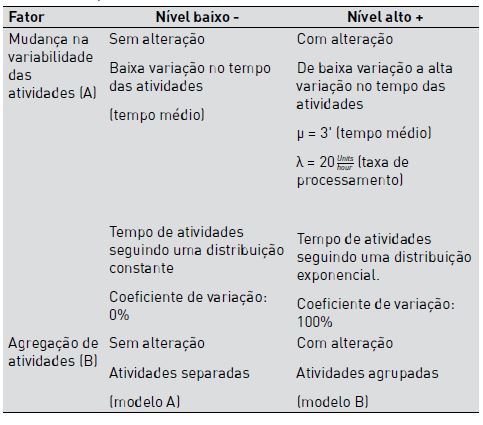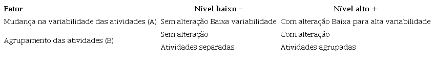 Esse experimento utilizou um projeto fatorial 2x2, incorporando duas variáveis ou fatores (variabilidade da atividade e uso de agrupamento de recursos) com dois níveis distintos (Tabela 2).