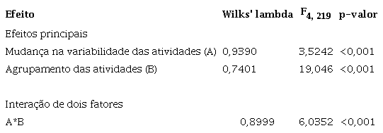 Os dois efeitos principais e a interação entre eles foram significativos (Agregação de atividades: Wilk's lambda = 0,7401; F = 12,046; p < 0,001 ; Mudança na variabilidade das atividades: Wilk's lambda = 0,9390; F = 3,5242; p < 0,001; Agregação de atividades x Mudança na variabilidade das atividades: Wilk's lambda = 0,8999; F = 6,0352; p < 0.001).