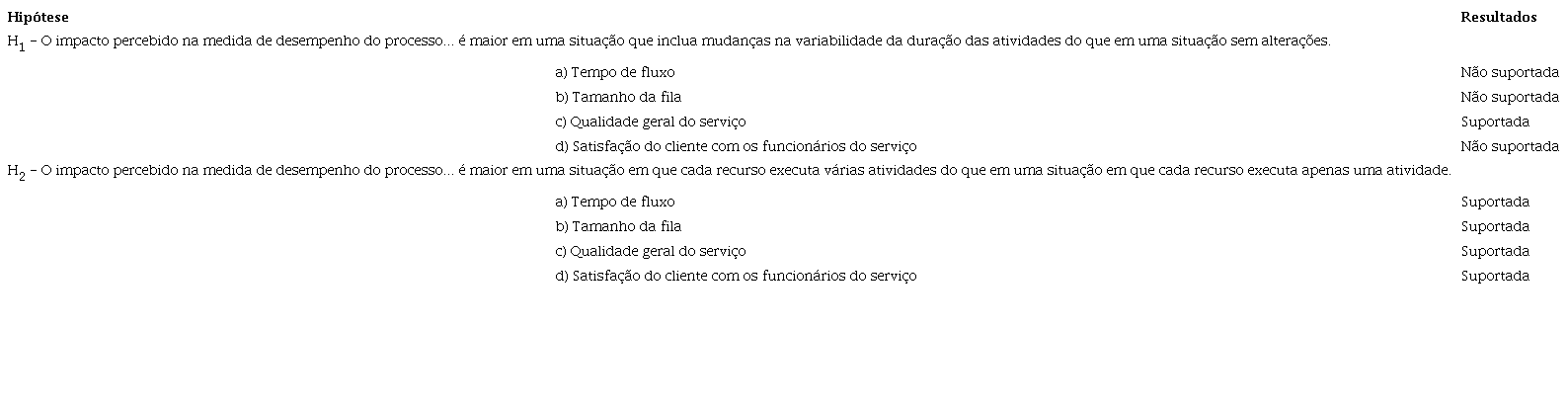 H2- O impacto percebido nas medidas de desempenho do processo (tempo de fluxo - H2a; tamanho da fila - H2b; qualidade geral do serviço - H2ce satisfação do cliente com os funcionários do serviço - H2d é maior em uma situação em que cada recurso executa várias atividades do que em uma situação em que cada recurso executa apenas uma atividade.