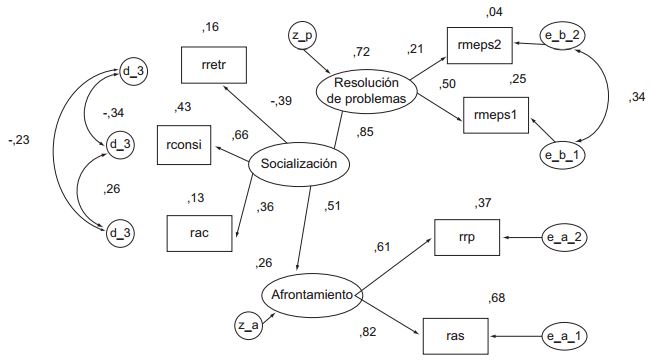 La respuesta al segundo objetivo conlleva aportar un modelo explicativo de las relaciones entre el proceso de socialización (BAS-3), las formas de afrontamiento de los problemas y las variables del Test Cognitivo-Visual que se relacionan con las habilidades de resolución de problemas. Nuestra propuesta está expuesta en la figura 1 , que ofrece un grado de ajuste aceptable -GFI= 0.994; AGFI=0.981; RMSEA=0.000; CFI=1.000 y con el valor de P (0.566). El modelo permite observar que las variables socializadoras más importantes tienen que ver con el retraimiento social (rretr), siendo esta influencia negativa (-.39); la consideración de los demás (rconsi), que obtiene el mayor peso significativo (.66); y el autocontrol en las relaciones sociales (rac) (.36). Por otra parte, estrategias de afrontamiento importantes que se desarrollan en esta etapa evolutiva, y ejercen un peso significativo, son la búsqueda de apoyo social (ras) (.82), y la capacidad de concentración para resolver el problema (rrp) (.61). Por último, en relación con la resolución de problemas, se constata una relación con el número de medios (rmeps1) que identifican los escolares (.50), ofreciendo dicha resolución un peso de menor significación a los obstáculos considerados (rmeps2) (.21). Los datos sugieren que en este periodo domina una resolución de problemas orientada por la inmediatez de la respuesta.