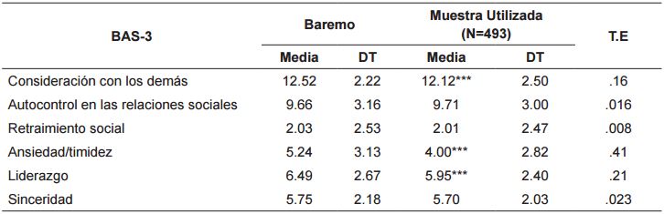 Esta realidad es la que señalan nuestros resultados referidos al proceso de socialización, evaluado por el BAS-3 (Batería de socialización): diferencias significativas en las subescalas de consideración con los demás, ansiedad social / timidez y liderazgo. En los tres casos los adolescentes de la muestra tienen puntuaciones medias más bajas, por lo que se identifica una menor sensibilidad social o preocupación por los más rechazados; sin embargo, son adolescentes más tranquilos a la hora de entablar contactos con los demás, tal y como demuestra el reconocimiento de su escaso grado de ansiedad o timidez en sus relaciones sociales –estos resultados encuentran apoyo en la literatura sobre el tema ( Rodríguez, Droguett & Revuelta, 2012 ) –. Igualmente, la menor puntuación en liderazgo indica que poseen una menor habilidad de iniciativa, popularidad y confianza en sí mismos; a su vez, el autocontrol en las relaciones sociales refiere un mayor conocimiento y acatamiento de las normas que en la población general, lo que presumiblemente facilitará una convivencia positiva (Varela, Avila & Martínez, 2012).