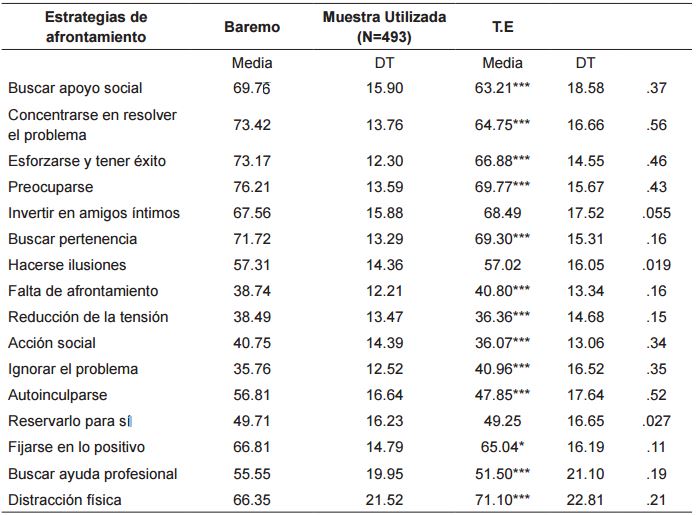 La tabla 2 presenta los datos descriptivos para las estrategias de afrontamiento que utilizan los adolescentes para resolver una determinada situación problemática, a la vez que el nivel de significación de la prueba T para una muestra con los datos obtenidos en la muestra para su adaptación. Los resultados identifican unos adolescentes que buscan actividades que les permitan distraerse de la situación conflictiva, como la distracción física, mientras que en menor medida se encuentran la reducción de la tensión y la acción social.