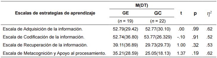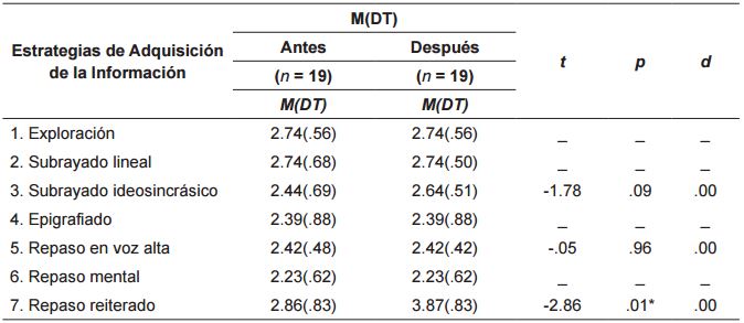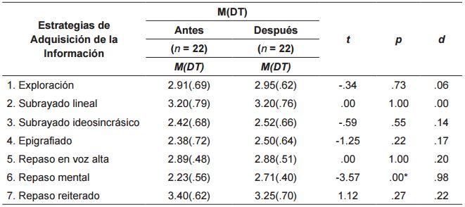 Asimismo, como puede observarse en la tabla 4 , se encontraron diferencias intragrupo en el grupo experimental en las estrategias de repaso reiterado (t = -2.86, p = .01) antes-después de la intervención con un valor del efecto pequeño (d = 0.00).