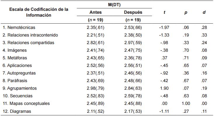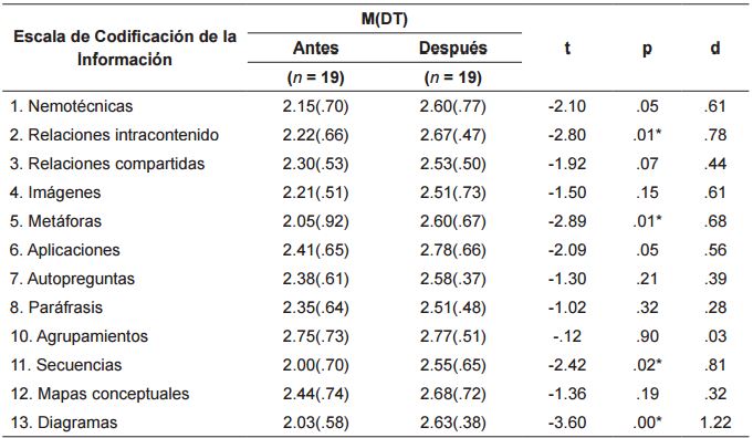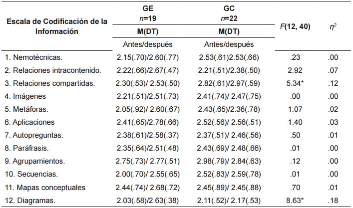 Se encontraron diferencias significativas en cuanto a las estrategias de codificación de la información entre el grupo experimental y el grupo control después de la intervención a favor del grupo experimental en el uso de estrategias de relaciones compartidas, F(12, 40) = 5.34, p<.05, η2 = 0.12, y diagramas, F(12, 40) = 8.63, p<.05, η2 = 0.18 ( ver tabla 6 ).