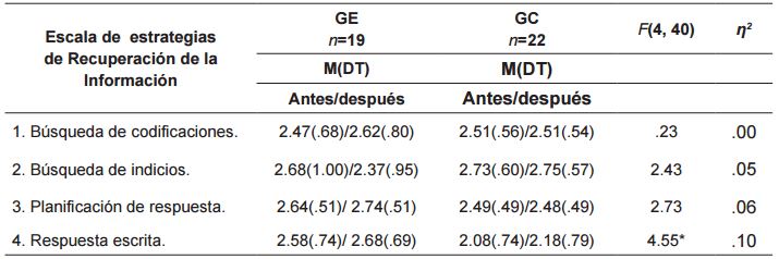 Seguidamente, como puede observarse en la tabla 9 , se encontraron diferencias significativas en las estrategias de recuperación de la información después de la intervención en las estrategias de respuesta escrita a favor del grupo experimental; la varianza explicada fue baja: F(4, 40) = 4.55, p<.05, η2 = 0.10.