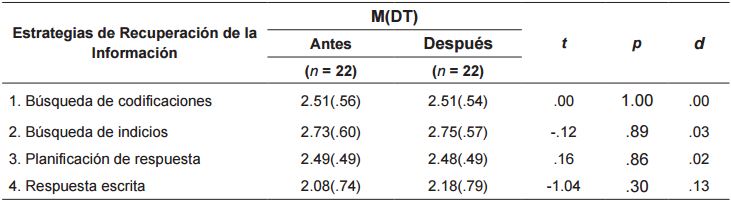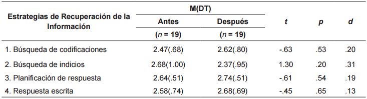 Y no se encontraron diferencias significativas intragrupo después de la intervención en ninguna de las estrategias de la Escala de Recuperación de la Información ni el grupo experimental ( ver tabla 10 ) ni en el grupo control ( ver tabla 11 ).