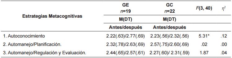 Igualmente, se encontraron diferencias significativas después de la intervención en las estrategias de autoconocimiento a favor del grupo experimental, siendo la varianza explicada baja: F(3, 40) = 5.31, p<.05, η2 = 0.12 ( ver tabla 12 ).