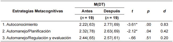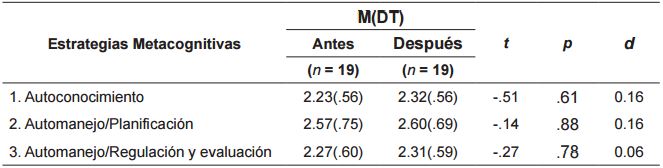 También se encontraron diferencias significativas intragrupo en el grupo experimental después de la intervención dentro de las Escala de Estrategias Metacognitivas en las estrategias de autoconocimiento (t = -3.61, p = .00, d = 0.83) y planificación (t = -2.12, p = .04, d = 0.42), siendo alto el valor del efecto alto en ambas ( ver tabla 13 ).