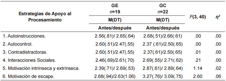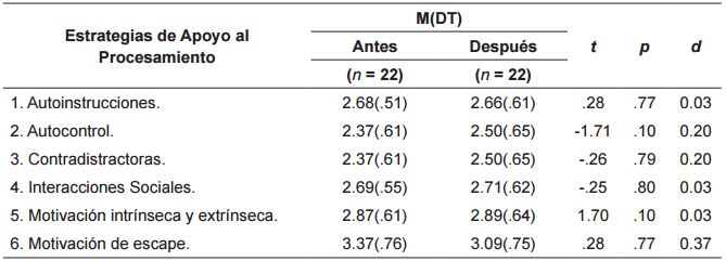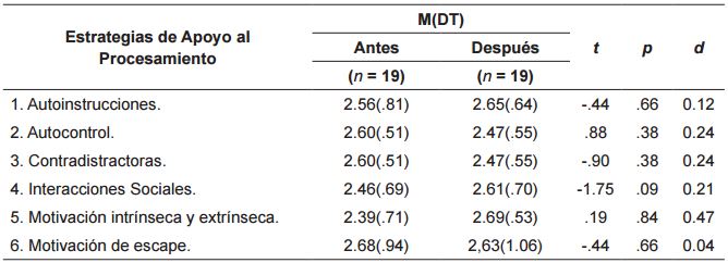 Por último, no se encontraron diferencias significativas después de la intervención en ninguna de las estrategias de Apoyo al Procesamiento, y el valor del efecto fue bajo ( ver tabla 15 ).