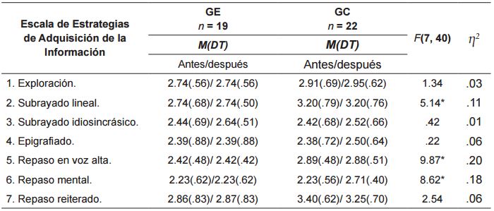Como puede observarse en la tabla 3 , se hallaron diferencias significativas en cuanto a las estrategias de adquisición de la información respecto a ellos mismos y comparados con alumnos semejantes no entrenados en la evaluación después de la intervención, en las estrategias de subrayado lineal, F(7, 40) = 5.14, p<.05, η2 = 0.11, estrategias de repaso en voz alta, F(7, 40) = 9.87, p<.05, η2 = 0.20, y en repaso mental, F(7, 40) = 8.62, p<.05, η2 = 0.18, a favor del grupo control.