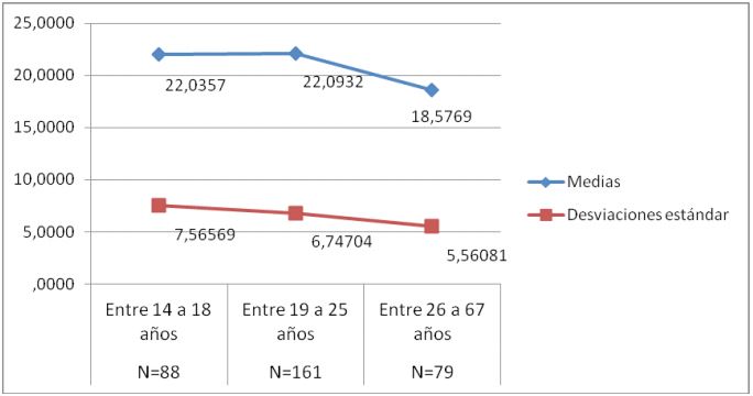 Sin embargo, sorpresivamente, se aprecia correlación significativa y negativa entre la edad y la identificación con la orientación sexual. Es decir que a mayor edad, los participantes tienden a tener menor alineación con la propia orientación sexual. Igualmente, la prueba discrimina adecuadamente con respecto a la variable autoidentificación con la orientación sexual. Específicamente, se encontraron diferencias significativas en los niveles promedio de homonegatividad internalizada entre quienes se autoidentificaron como homosexuales (media=20,51; DE=6.14) y quienes se autoidentificaron como bisexuales (media= 23, DE = 6.41) (t=2.08, p=.041). Otro dato importante es que no hubo diferencias significativas en los niveles promedio de homonegatividad internalizada según rango de edad. La figura 1 ilustra que los promedios de homonegatividad internalizada en los tres grupos formados son bastantes similares y no se evidenciaron cambios significativos (F=0.82; p=0.43).