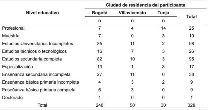 En este estudio participaron 328 personas con algún grado de identificación con la orientación sexual homosexual. La edad de los participantes osciló entre 14 y 67 años cumplidos con un promedio total de 23 (mediana =20, dt. 7.62). Los participantes residían en las poblaciones del centro de Colombia: Bogotá, Villavicencio y Tunja. La composición por ciudad según nivel educativo puede observarse en la tabla 1. Como se observa allí, la mayoría de los participantes tenían estudios secundarios completos o eran estudiantes universitarios al momento de participar en el estudio.