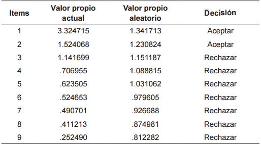 Con el fin de establecer el número de factores a retener, se procedió a realizar un Análisis Paralelo AP (tabla 5), el cual compara los valores propios de los datos del estudio actual con valores propios aleatorios. El método consiste en “retener aquellos factores siempre que se cumpla que el valor propio del estudio actual supere el valor propio del estudio aleatorio o simulado” (Brett, Ted & Andrys, 2010, p. 8).