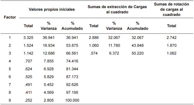 Para establecer la validez de constructo se procedió a aplicar el análisis factorial, el cual es uno de los métodos de reducción más importantes, cuyo objetivo es poder explicar el mayor porcentaje de varianza con el menor número de factores. Los resultados del índice de Kaiser-Meyer-Olkin KMO (0.784) y del test de esfericidad de Bartlet (854.55; p=.000) señalan que un análisis factorial es adecuado. Así, se procedió a realizar un Análisis Factorial Exploratorio (AFE) mediante Factorización de Ejes Principales, siendo este el método de extracción más adecuado cuando los ítems se encuentran bastante correlacionados y porque es una de las estrategias analíticas más ampliamente empleadas para analizar la estructura factorial de escalas compuestas (Afifi & Clark, 1999; Hair, Black, Babin, Anderson & Tatham, 2005; Tabachnik & Fidell, 2006).