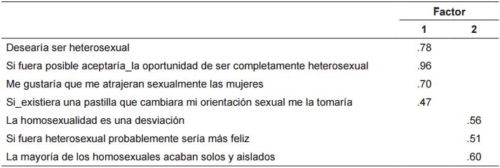 Así, se confirma que en el primer factor se encuentran agrupados cuatro ítems relacionados con la influencia del heterosexismo. Como lo se- ñalara uno de los jueces, es un factor relacionado con “la posibilidad de cambiar la orientación sexual”. Los restantes tres ítems del otro factor hacen parte de un factor individual relacionado a sentimientos negativos (felicidad/infelicidad) hacia la propia homosexualidad. Esto confirma de nuevo la teoría de Herek y Glunk (1995), Meyer (1995) y Meyer y Dean (1998). En consecuencia, como se verá a continuación, el constructo homonegatividad internalizada se puede medir con estos siete ítems sin alterar la confiabilidad de la PHI.