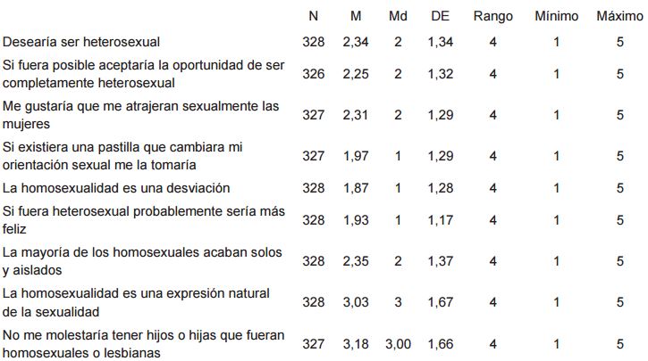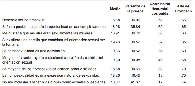 Adicionalmente, los ítems que menos contribuyen a la confiabilidad, en tanto que si se eliminan la confiabilidad aumenta, son los ítems formulados en sentido positivo: La homosexualidad es una expresión natural de la sexualidad y No me molestaría tener hijos o hijas homosexuales o lesbianas. Tales ítems también tendieron a tener puntuaciones promedio de tres, lo cual es indicador de que los participantes se mostraron indiferentes ante el ítem, al tiempo que no asumieron una postura clara de acuerdo o de desacuerdo. Esto coincide con el hecho de que las correlaciones ítem-total para estos dos ítems son menores a 0.30.
