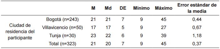 No obstante, todos los ítems alcanzaron los valores mínimo y máximo esperados teóricamente (entre 1y 5). Esto implica que también la escala total tomó valores entre 9 y 45, acorde con lo esperado teóricamente. También se observan desviaciones estándar de los ítems bajas y muy similares con rangos entre 1 y 2. Por otro lado, el constructo homonegatividad internalizada se distribuyó normalmente (KolmogorovSmirnov = 1.28. p = .074). La tabla 3 muestra los resultados promedio, mediana, mínimo y máximo, así como desviaciones estándar en cada una de las tres ciudades donde se aplicó la prueba. Es de resaltar la similitud de los valores promedio de los participantes residentes en las ciudades de Bogotá y Tunja, al igual que la tendencia a puntuar más alto, en promedio, con respecto a los participantes residentes en Villavicencio.