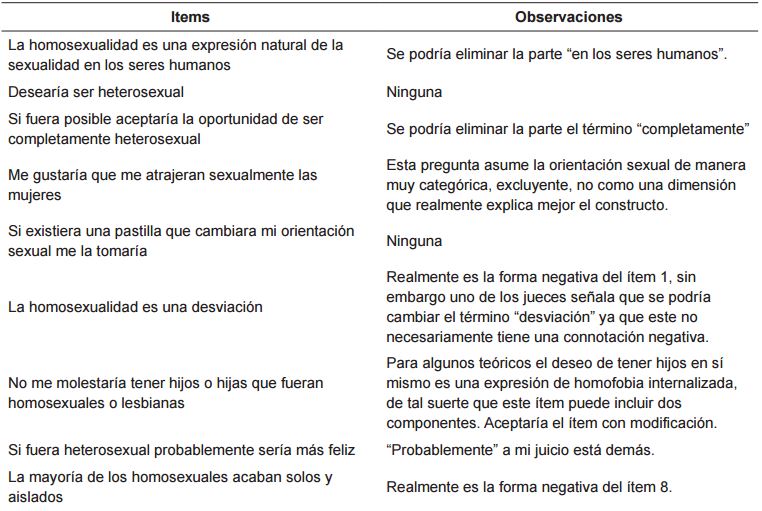 Por otro lado, debido a que la literatura previa señala la existencia de un único factor relacionado con el heterosexismo, sin señalar cuáles ítems se agrupan alrededor de dicho factor, se obtuvo respuesta solo de uno de los jueces acerca de la suficiencia del número de ítems que dieran cuenta del constructo homonegatividad internalizada. En efecto, el juez experto señaló: “No tengo claro las dimensiones que se recogen en cada uno de los reactivos” y añadió: “es evidente que hay una dimensión sobre la posibilidad de cambiar la orientación sexual (ítems 2, 3, 4, 5); naturalidad/normalidad de la homosexualidad (ítems 1, 6); percepción de la felicidad como homosexual (# 8, 9); El numero 7 no tiene categoría evidente”. Este dato se contrastará con el resultado de validez de constructo.