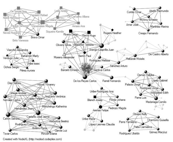 Gracias a las propiedades visuales de la figura 1 (que para efectos de la visualización fue organizada de acuerdo al país de adscripción institucional de los autores), claramente se puede observar que los autores de instituciones colombianas son los que representan mayor centralidad dentro de la red general, seguidos por personalidades de países como España, México, Canadá y Estados Unidos, quienes entre sí crean las redes más claras y representativas de colaboración. Este grupo principal se encuentra conformado por dos autores sobresalientes: Carlos de los Reyes y Juan Carlos ArangoLasprilla, quienes representan el centro de conexiones para la mayoría de los participantes en esta red, pues conforman grupos que terminan significando conexiones paralelas con autores de diferentes latitudes, así permiten que actores con menor grado de centralidad se ubiquen de mejor forma.