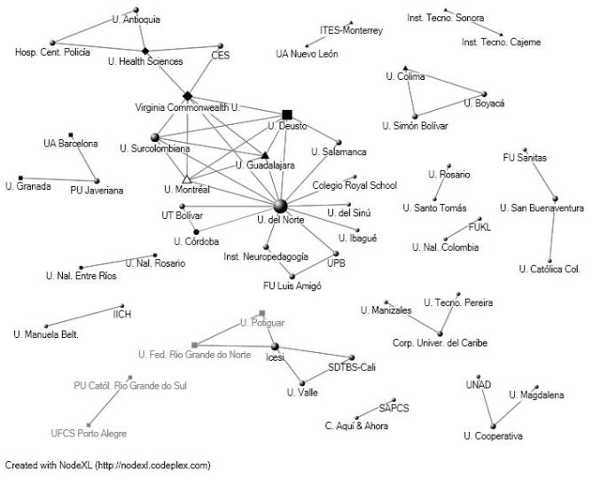 Como era de esperarse la Universidad del Norte –institución editora– representa el establecimiento con mayor grado de centralidad (18.31), guardando gran distancia con otras instituciones registradas; sin embargo, sobresale la buena posición cooperativa de entidades extranjeras como la Universidad de Deusto (España), la Universidad de Guadalajara (México) y la Virginia Commonwealth University (USA).