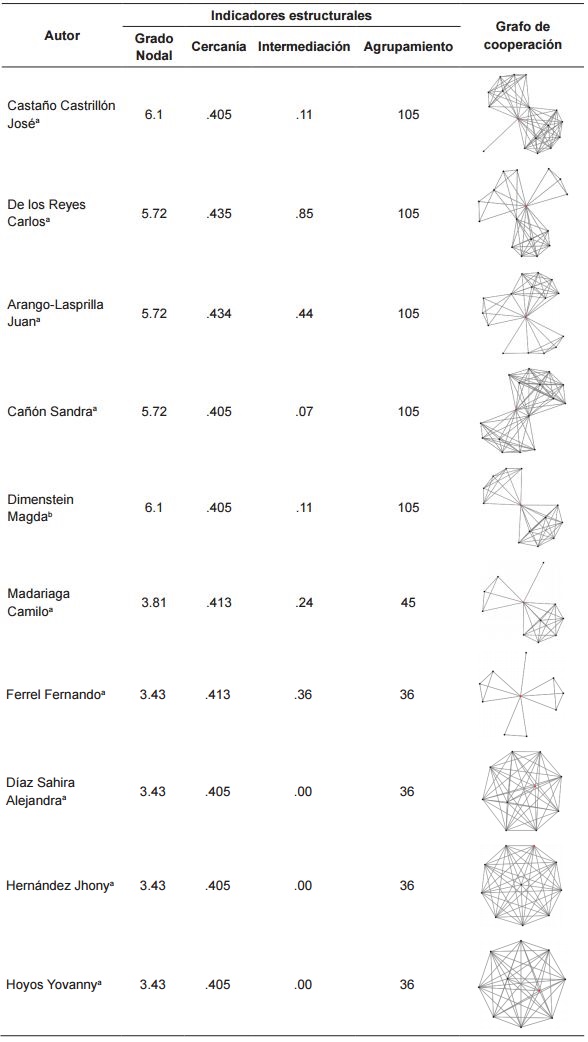 Para desagregar la información contenida en los datos descriptivos de la tabla 3 se construyeron grafos que representan la totalidad de las redes de autores e instituciones. Para el primero de los casos, inicialmente se distingue un conjunto de articulistas como los más sobresalientes por poseer los indicadores estructurales de más alto rendimiento, es decir, se trata de autores con varias publicaciones en la revista, quienes además gozan de un número importante de conexiones directas e indirectas con otros investigadores que también han publicado en PDC. En la tabla 4 se incluyen los 10 autores más sobresalientes con sus respectivos indicadores y el subgrafo de cooperación que define la capacidad de agrupamiento y las conexiones que establecen con otros investigadores.