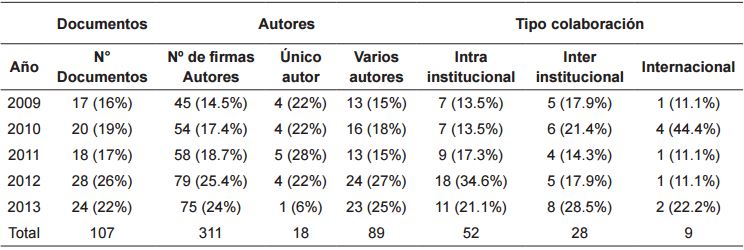Se analizaron 12 números de la revista en los cuales se registraron 107 documentos, 263 autores con 311 firmas y 72 instituciones. El número de documentos publicados muestra un aumento entre 2009 y 2013, pasando de un mínimo de 17 artículos a un máximo de 28 los cuales se publicaron en el año 2012; el promedio de documentos publicados en el quinquenio abordado en este estudio fue de 21.4. El número de autores por año de publicación también ha ido en aumento, pasando de 45 en 2009 a una cifra de 75 en 2013, con un promedio de 2.9 autores por trabajo. La tabla 1 amplía la información de los indicadores hallados.