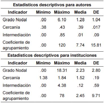 Análisis de datos: Luego de clasificar todos los datos, se procedió a calcular por autores e instituciones los diferentes indicadores estructurales de las redes empleando Ucinet; para este estudio se obtuvieron los siguientes datos: a) grado nodal (suma de los actores que están conectados directamente), b) cercanía (capacidad de un actor para alcanzar a todos los actores de la red), c) intermediación (posibilidad de un actor para mediar la comunicación entre otros miembros de la res), d) densidad (medida que hace referencia a los altos o bajos niveles de conectividad de la red) y e) coeficiente de Clusters (medida que cuantifica los valores de agrupación de un actor con otros), esta información se exportó a SPSS 18.0 para su análisis descriptivo. Finalmente, los grafos de las redes fueron generados con el programa de código abierto NodeXL Excel Template, por sus sobresalientes recursos gráficos.