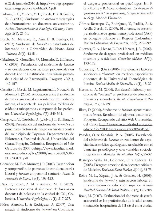 En el siglo XXI, la investigación sobre el burnout se ha ido consolidando en Latinoamérica y se le da reconocimiento como un problema de salud vinculado a los riesgos psicosociales en y del trabajo ( Gil-Monte, 2007 ). Se considera que el estudio del burnout ha avanzado en la medida en que se considera como una problemática de salud que se presenta en el contexto laboral y no es solo un asunto de las profesiones asistenciales, que han sido las más estudiadas. Se reconoce que la responsabilidad ya no es del individuo, sino que es un fenómeno que se da en la interacción con el mundo del trabajo, en la relación trabajo-persona. Es importante insistir en ampliar el marco de lectura del síndrome, desde la realidad social y económica concreta, en aras de la reflexión tanto de la relación entre el trabajo y la salud como también la de sociedad, para lo cual es necesario convocar a otras disciplinas, para que la aproximación paradigmática sea otra, y así lograr trascender a un análisis más macro de las problemáticas inscritas en el campo de la salud mental laboral y contribuir a su comprensión.