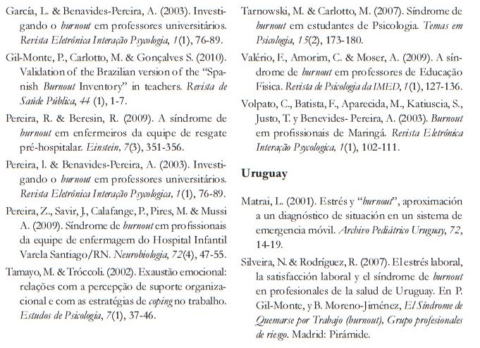 También se encuentran estudios centrados en la preocupación por validar los diferentes instrumentos desarrollados por Maslach y por GilMonte. Para el MBI (Maslach Burnout Inventory) se encontró la validación de Buzzetti (2005), en dirigentes del Colegio de Profesores de Chile, la de Alvarado (2009), en la versión castellana en educadores costarricenses; la realizada por Grajales (2000), en la versión española en una población de profesionales mexicanos y la de De Souza, Faverzani, Mamore y Liberali (2009), en Brasil.