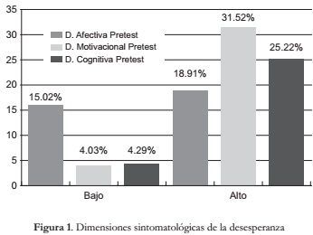 Se evidenciaron niveles altos de desesperanza (M=1,59, DT= 0,49), al contrastarse con los subpuntajes de caracterización sintomatoló-gica, se identificó una marcada tendencia a las dimensiones motivacional (31.52%) y cognitiva (25.22%), tal como lo ilustra la Figura 1.