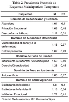 vación emocional (M=1,66; DT=0,48), entram-pamiento (M=1,62; DT=0,49) e insuficiente autocontrol (M=1,59; DT=0,49), asociados a los dominios de sobrevigilancia, desconexión/ rechazo, autonomía deteriorada y falta de limites, respectivamente (ver Tabla 2).