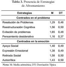 En lo relativo a las Estrategias de Afronta-miento observamos una fuerte tendencia de los militares a la Evitación de Problemas (M=1,65, DT= 0,48), la Retirada Social (M=1,58, DT= 0,5) y Reestructuración Cognitiva (M=1,56, DT=0,5). Las dos primeras concernientes a estrategias desadaptativas, centradas en la emoción y el problema, respectivamente, y la tercera a una estrategia adaptativa centrada en el problema (ver Tabla 3).