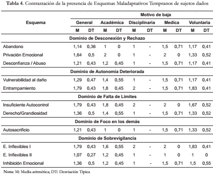 Analizamos específicamente el perfil cognitivo reportado por los sujetos dados de baja. En este sentido, se observó una tendencia general congruente con la muestra diana de estudio. Sin embargo, los sujetos que reportaron baja disciplinaria, o voluntaria, no reportaron ningún esquema del dominio de Desconexión/ Rechazo, y aquellos de baja médica registraron presencia de vulnerabilidad al daño (M=1,5, DT= 0,71), Entrampamiento (M=1,5, DT= 0,71) e Inhibición emocional (M=1,5, DT= 0,71), siendo los dos primeros del dominio de Autonomía Deteriorada y el ultimo del dominio de Sobrevigilancia (ver Tabla 4).