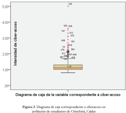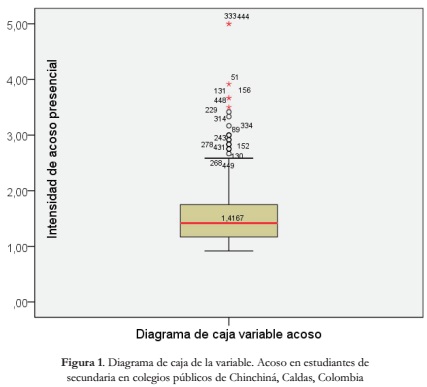 En las Tablas 2 y 3 se describen las variables asociadas al acoso escolar (Bullying). Referente al acoso presencial se obtuvo un 1.5% (LC95%:0.8%-2.1%) en el nivel 3-4 de acoso y 0.4% en el nivel 4-5 (lc95%:0%-1.1%), con una mediana de 1.42. La Figura 1 es la representación de esta variable en forma de diagrama de caja. Allí se observan dieciséis casos con nivel de acoso mayor de 2.5, que se pueden considerar los estudiantes más acosados, teniendo en cuenta la distribución de valores que presenta el diagrama de caja. En particular los marcados con los números 333 y 444 presentan niveles de acoso próximos a 5 (máximo). El cuestionario muestra una a de Cronbach de .837. En la Tabla 3 se muestran también las subescalas correspondientes.