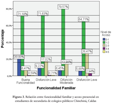 En la Tabla 4 se observa una relación significativa entre funcionalidad familiar y acoso presencial (p=0.01), como se observa en la Figura 3, en la cual se destaca que el nivel de acoso muy bajo (0-1) tiene un máximo de 20% en el nivel correspondiente a buena funcionalidad familiar. A medida que aumenta el nivel de disfunción familiar también aumentan los niveles de acoso hasta que en el nivel disfuncionalidad severa el acoso 2-3 aparece con 26.5%.