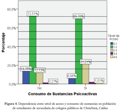 El consumo de sustancias psicoactivas presenta relación significativa con acoso; al comparar el perfil de acoso de los no consumidores con los consumidores, resalta que el perfil decrece en los niveles de acoso 0-1, 1-2 y aumenta en los otros niveles. En este caso sucede el mismo fenómeno comentado anteriormente, en el sentido de que esta dependencia del perfil de acoso con consumo de sustancias se reproduce en el perfil de acosador.