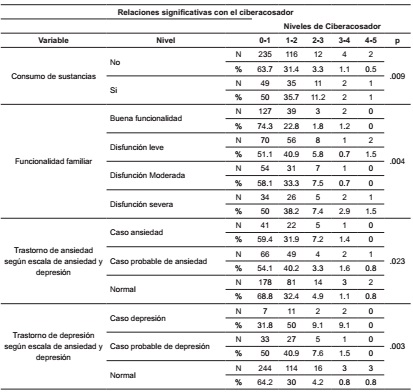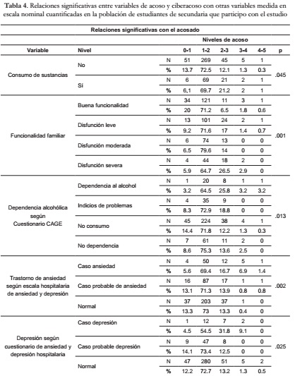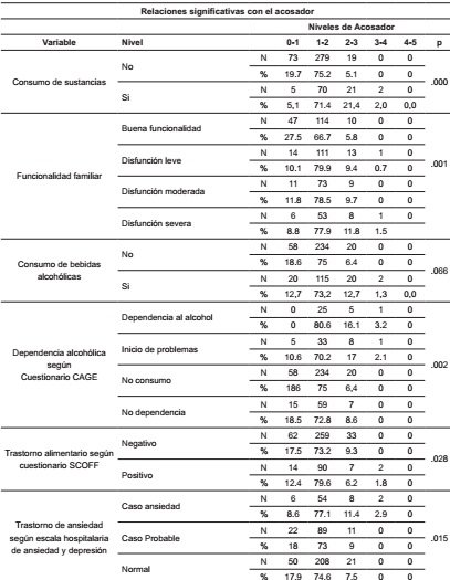 Análogamente en la Tabla 4 se muestra una relación significativa entre nivel de acosador y consumo de sustancias psicoactivas (p=0.000).