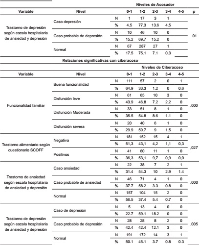 Abstract: This study aimed to identify the frequency of bullying and cyberbullying and associated fac-tors in a representative sample of 475 high school students in three public institutions of Chinchiná (Colombia) in 2014. This is a cross sectional study. Demographic variables were taken; family functioning was assessed by the family APGAR scale instrument, taken with the CAGE (Cut, Annoyed, Guilty, Eye) scale, anxiety and depression, with hospital scale of anxiety and depression (HAD), eating disorders SCOFF (Scik Control On Fast Food), scale bullying staff through the survey about coexistence school for students and cyberbullying through Patchin scale. According to the questionnaire employed a high ranking proportion of 1.9% was found, 4% bullies, cyber bullying 1.3%, 1.9% cyberbulliesin the middle bullying 14%, 8.5% stalker 5.5% cibera-sew, 4.9% cyber attackers. Significant relationships between the level of harassment and family functioning, alcohol consumption, anxiety, depression, substance abuse levels were found, level of cyberbullying also disordered eating behavior. We found that factors associated Aphek-as both bullies and bullied, result similar to that found in other studies. In this population, high levels of harassment have low proportions, not harassment levels low and medium.