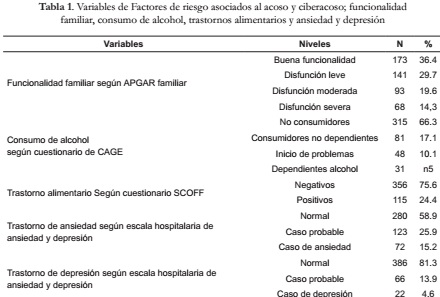 La Tabla 1 incluye los factores asociados al acoso y ciberacoso escolar. Se encuentra que la población estudiada presenta en un 36.42% (lc95%:32.12%-40.95%) buena funcionalidad familiar. El 66.32% (lc95%:61.84%-70.52%) de la población no consume bebidas alcohólicas, y 6.53% (lc95%:4.55%-9.24%) son consumidores dependientes. Según el cuestionario SCOFF el 24.4% (lc95%: 20.8%-28%) sufren de algún tipo de trastorno de la conducta alimentario. El 15.2% (lc95%:12.12%-18.78%) y el 4.6% (lc95%:2.99%-7.04%) de la población presenta casos de ansiedad y depresión respectivamente.