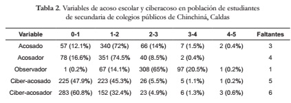 Resumen: El presente estudio tuvo como objetivo identificar la frecuencia del acoso y ciberacoso escolar y los factores asociados en una muestra representativa de 475 estudiantes de secundaria en tres instituciones públicas del municipio de Chinchiná, en el departamento de Caldas, Colombia, en el año 2014. La población fue seleccionada mediante un muestreo probabilístico estratificado por grado y género. Aplicamos las escalas: APGAR familiar, CAGE (Cut, Annoyed, Guilty, Eye), Escala Hospitalaria de Ansiedad y Depresión (HAD), la SCOFF (Scik Control On Fast Food), el acoso escolar por medio de la encuesta sobre convivencia escolar para alumnos, y el ciberacoso por medio de Escala de Patchin. De acuerdo al cuestionario empleado se encontró una proporción del más alto nivel de acoso del 1.9%, 0.4% acosadores, 1.3% ciberacoso, 1.9% ciberacosadores, en rango medio, 14% acoso, 8.5% acosador, 5.5% ciberacoso, 4.9% ciberagresores. Se encontraron relaciones significativas entre nivel de acoso y funcionalidad familiar, consumo de alcohol, ansiedad, depresión, consumo de sustancias, nivel de ciberacoso también con trastornos de la conducta alimentaria. Los factores asociados con acoso y ciberacoso afectan por igual a acosados y acosadores, resultado también encontrado en otros estudios. En esta población se presentan principalmente niveles de acoso medio y bajo.