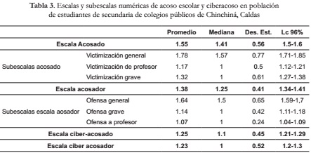 Referente a los acosadores presenciales en la Tabla 2 se encuentra un 0.4% en el rango 3-4 (lc95%:0%-1.1%), con una mediana de 1.25. El diagrama de caja correspondiente a esta variable presenta diecinueve casos que se pueden considerar los máximos acosadores. Sin embargo, el más alto acosador tiene un valor de 3.5 (en escala de 1 a 5) no habiendo acosadores entre 4 y 5. El cuestionario tiene un a de Cronbach .832. Igualmente, la Tabla 3 despliega las variables correspondientes a la escala de acoso.