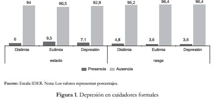 En la figura 1, se presentan los resultados de los escala IDER. En su mayoría, estos participantes cuidadores formales en cuanto a la presencia/ no presentan depresión como estado ni como ausencia de los distintos componentes de la rasgo.
