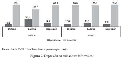 En la figura 2, se muestran los resultados de los cuidadores informales en cuanto a la presencia/ ausencia de los distintos componentes de la escala IDER. Entre estos cuidadores hubo un porcentaje importante que puntuó con presencia de eutimia estado.