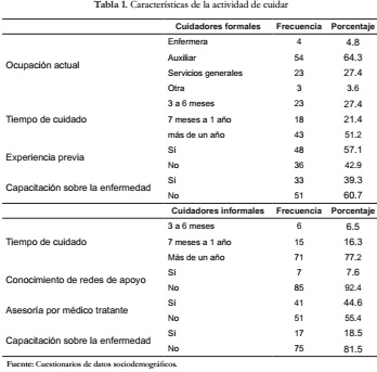 La tabla 1 presenta las características de la labor desempeñada tanto por los cuidadores formales como por los informales. Se destaca que la mayoría de los participantes han estado ejerciendo ese rol por un año o más y reportan no haber recibido capacitación sobre la enfermedad de Alzheimer.