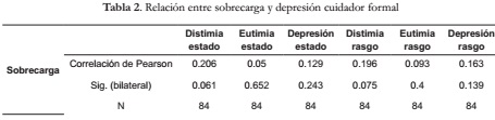 Ahora bien, respecto de la relación entre sobrecarga y depresión, se encontró que en el grupo de cuidadores formales dichas variables no presentaron correlaciones significativas en el ámbito de p<0.05, mientras que en los informales la sobrecarga mostró una asociación positiva significativa en el ámbito de p<0.01 con distimia y depresión estado y distimia y depresión rasgo.