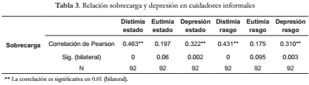 Respecto de los cuidadores informales, como puede observarse en la tabla 3, la variable sobrecarga presentó asociaciones positivas significativas en el ámbito de p<. 01 con distimia estado y rasgo y con depresión estado y rasgo.