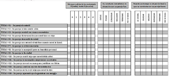 Para el cumplimiento de los Objetivos propuestos, los autores diseñaron el "Cuestionario para el registro de los efectos de situaciones mentirosas en la relación de pareja" (Figura 1), el cual mide los efectos de la mentira en las relaciones de pareja de jóvenes universitarios. Consta de 15 ítems, que presentan situaciones, mensajes o acciones que implicaban mentira, simulación, apariencia, ocultamiento o engaño. Su estructura consta de dos partes, una cuantitativa y otra cualitativa. La parte cuantitativa, evalúa en tiempo pasado la intensidad del grado de molestia que le causó la mentira de su pareja, según una escala tipo Likert con valores de 0 (nada) a 5 (mucho). La parte cualitativa, evalúa los efectos de la mentira en dos momentos: los efectos inmediatos de la mentira, según seis (6) criterios, Evitar, Pelear, Conversar, Reclamar, Terminar y, No sé nada; y, los efectos mediatos, pasado un tiempo después del reconocimiento de la mentira de su pareja, según seis (6) criterios: La misma, Olvidar, Mejorar, Distanciar, Terminar, y No sé nada. (Figura 1).