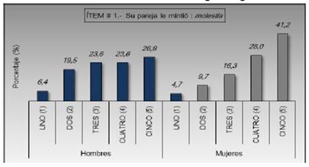 En cuanto al escenario general, se evidenció que todas las personas que hicieron parte de la muestra habían tenido experiencias de relación de pareja y habían experimentado algunas situaciones, mensajes o hechos que implicaban mentira en sus relaciones. Sin embargo, se hallaron algunas respuestas que indicaban la no vivencia de estas experiencias mentirosas (37.20% en el ítem #13 en mujeres: "contó un secreto"; y, 0.9% en el ítem # 2 en hombres: "hizo sentir celos"). En general, las respuestas se distribuyeron con diferente énfasis en las dos partes del Cuestionario.
